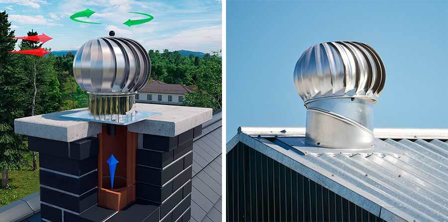 Активная головка дефлектора, вращаясь, создает разряжение в вентиляционном канале, за счет чего усиливается тяга и вентиляция работает эффективно.